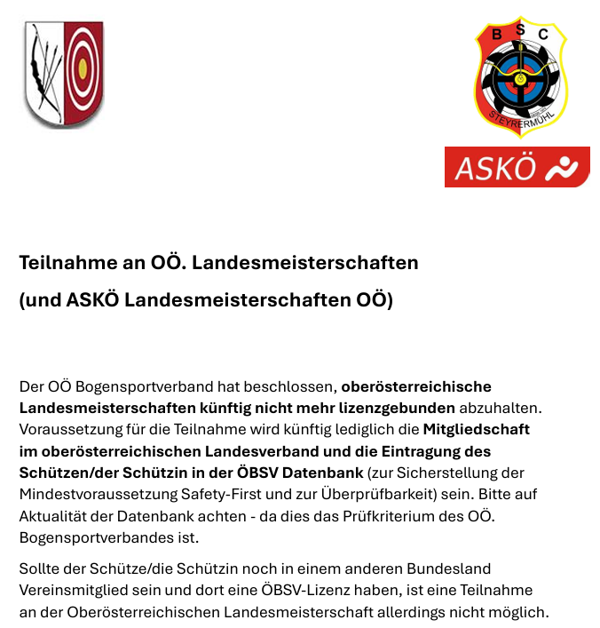 Wir möchten auf die Entscheidung des Oberösterreichischen Bogensportverbands, Oberösterreichische Landesmeisterschaften künftig nicht mehr lizenzgebunden abzuhalten, hinweisen. Dies hat auch für unser Traunseepokalturnier im Jänner die Folge, dass nur mehr für die Turnierwertung Lizenzpflicht besteht. An der OÖ-Landesmeisterschaft und der ASKÖ OÖ-Landesmeisterschaft könnt ihr (unter bestimmten Voraussetzungen - siehe Bild) auch ohne Lizenz teilnehmen.