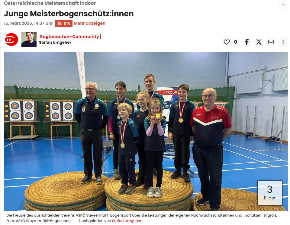 JUNGE MEISTERBOGENSCHÜTZ:INNEN. Bezirksrundschau Salzkammergut online. Online verfügbar unter Österreichische Meisterschaft indoor: Junge Meisterbogenschütz:innen - Salzkammergut [Zugriff: 15.03.2026]
